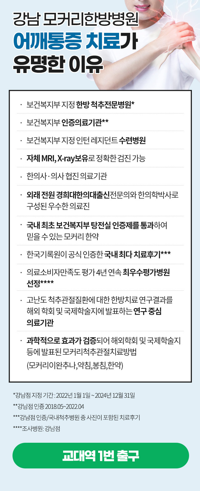 목디스크로 인해 어깨통증이 있는 경우에는 다른 어깨질환과의 감별진단을 잘 해야 합니다. 통증의 원인이 목디스크라면, 정확히 목디스크를 진단해서 치료해야 합니다. 저희 모커리한방병원은 목디스크의 치료가 일반적으로 허리디스크 치료보다 더 쉽고, 빠르다는 내용을 미국통증의학회에서 발표하였습니다.