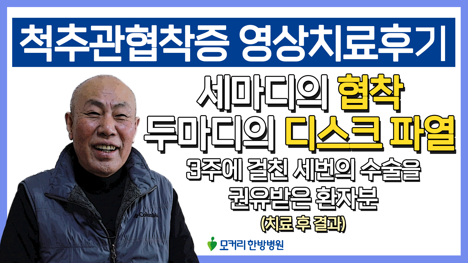 비수술로 협착증을 치료한다고 하는데 사실 주위에서도 한방으로 협착증이 치료 됐다는 얘기를 들어 본적도 없고 처음엔 믿음과 신뢰가 가지 않았습니다. 그렇지만 수술해도 후유증이 남는다는데 마지막으로 비수술 치료를 해보고 그때도 되지 않으면 수술하자는 아내의 권유로 모커리에 오게 됐습니다.