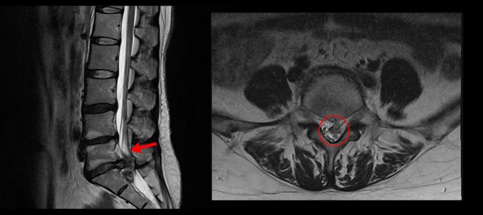 이 환자분의 허리 MRI를 보면 5번, 1번 디스크가 매우 심하게 터져 있는 것이 보입니다. 굉장히 심한 허리디스크터짐으로 인해 신경이 있어야 할 곳을 밀려나온 디스크 수핵이 거의 다 차지하고 있는 것을 볼 수 있습니다.