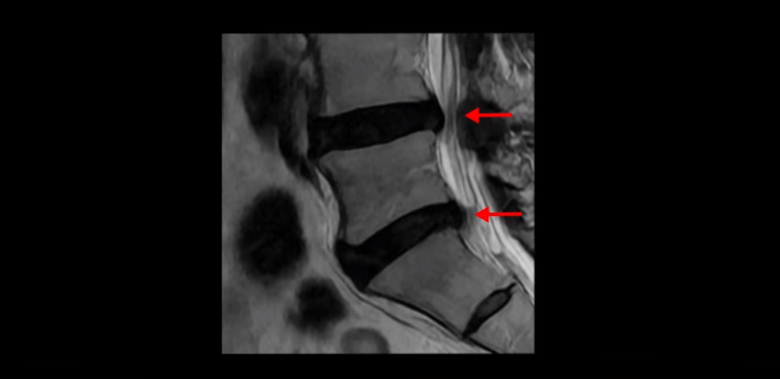 MRI를 보면서 설명해 드리겠습니다. 2마디에 퇴행성디스크가 있는데 심하지는 않습니다.