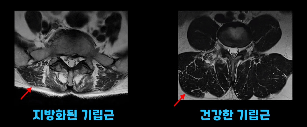 이 환자분의 가장 큰 문제는 허리를 펴는 근육인 척추기립근이 상당 부분 지방으로 변해서 하얗게 보이고 기립근의 크기도 많이 작아져 있습니다.