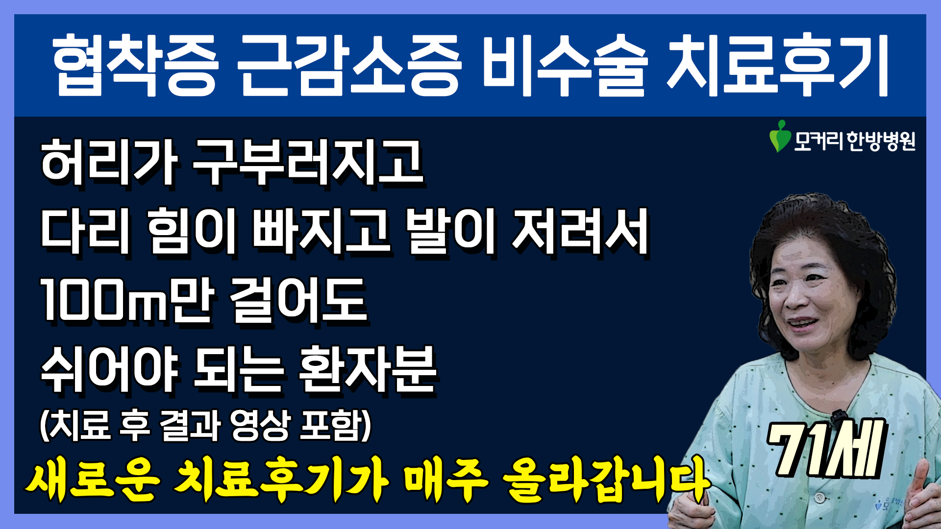 너무 힘들어서 안 되겠다고 하니까 애들도 실감을 하고 여기저기 병원을 알아보고 그랬거든요. 병명을 제대로 알고 치료를 하는 게 효과적일 것 같다. 딸도 그러면서 여기저기 알아보는 도중에 모커리한방병원이 있는데 여기 병원에다가 전화를 했나 봐요. 제 증상을 비수술로 낫게 해줄 수 있는 병원이 집 근처 가까이 있다고 엄마 집안일 다 제껴놓고 모커리 가서 입원 집중치료를 받는 게 맞는 것 같다 그래서 애하고 같이 왔어요.