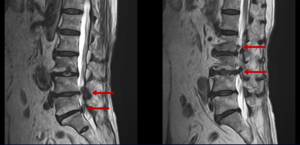 이분의 허리 MRI를 보면 여러 마디에 퇴행성 변화가 있습니다.