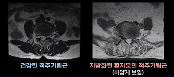 이 두 마디가 왼쪽 증상, 특히 허벅지 통증을 일으키는 원인으로 보입니다. 이렇게 여러 마디가 안 좋을수록, 또 고령일수록 수술하기가 더 까다로워지는데 또 큰 문제는 이 환자분은 근감소증이 심하게 진행된 상태로, 여기 MRI에서 보시다시피 허리 하부의 기립근 근육이 전부 지방으로 변해버려 근육 자체가 거의 없는 상태인 것입니다.