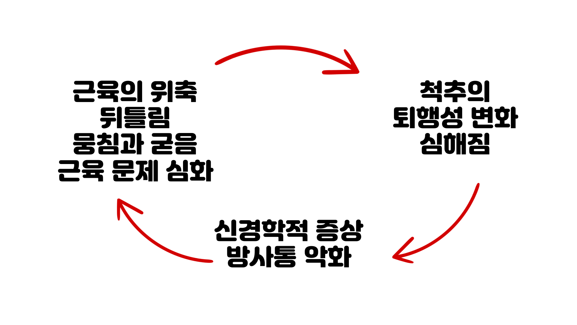 그래서 전방전위증이든 협착증이든 퇴행성디스크든 50대 이후에 발병하는 퇴행성 척추질환들은 이러한 악순환 때문에 계속 악화되는 경향이 강한 겁니다.
