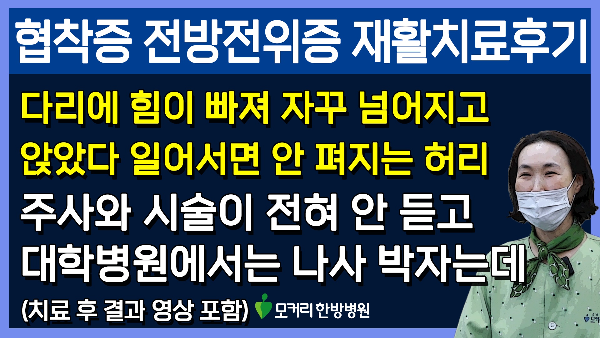 지인의 소개로 모커리에 왔어요. 또 유튜브에서 영상을 봤더니 전방전위증 1,2단계는 충분히 수술 없이도 회복할 수 있다고 말씀하신 원장님들이 계셔서 모커리에 오게 됐어요. 그리고 치료 받은 사람들이 많이 나아서 퇴원하고 치료후기를 봐도 정말 좋은 치료를 받고 나가신 분들이 많아서 저도 용기를 갖고 모커리에 오게 됐습니다.