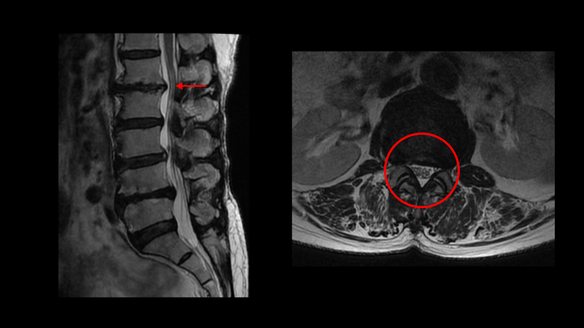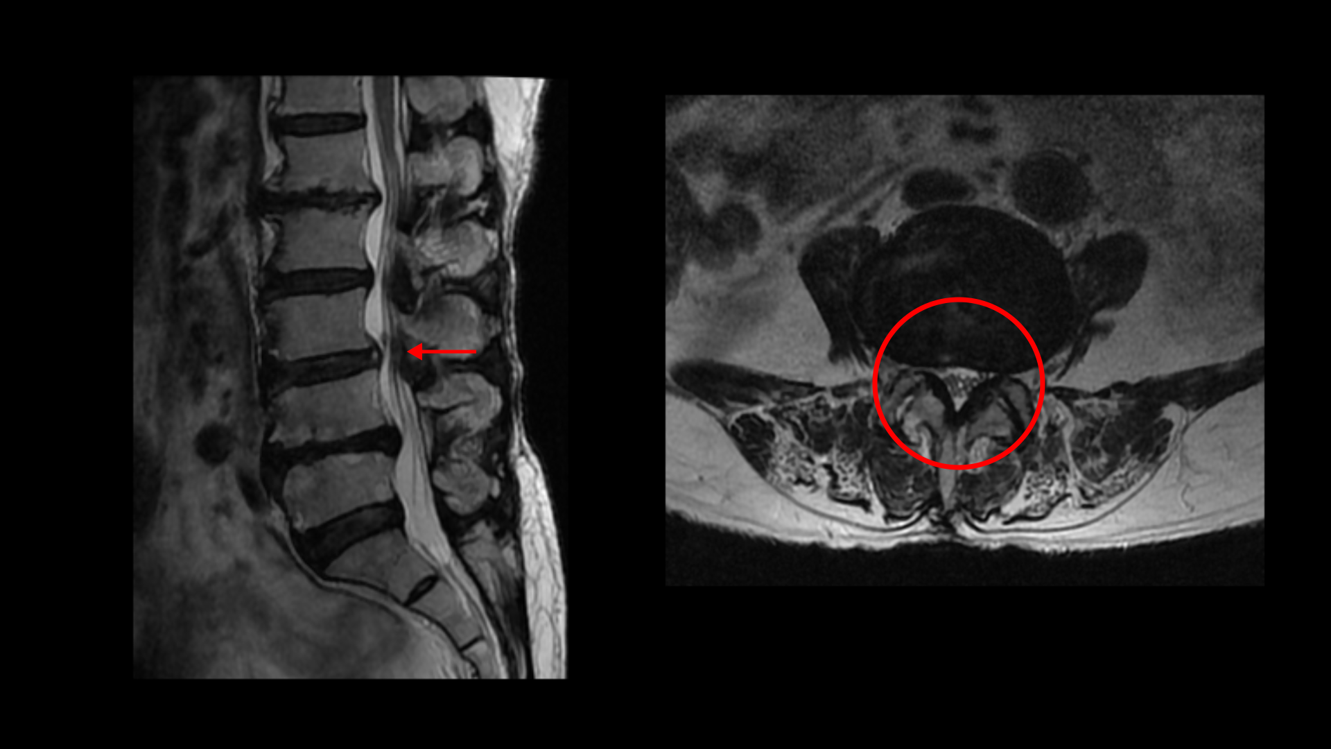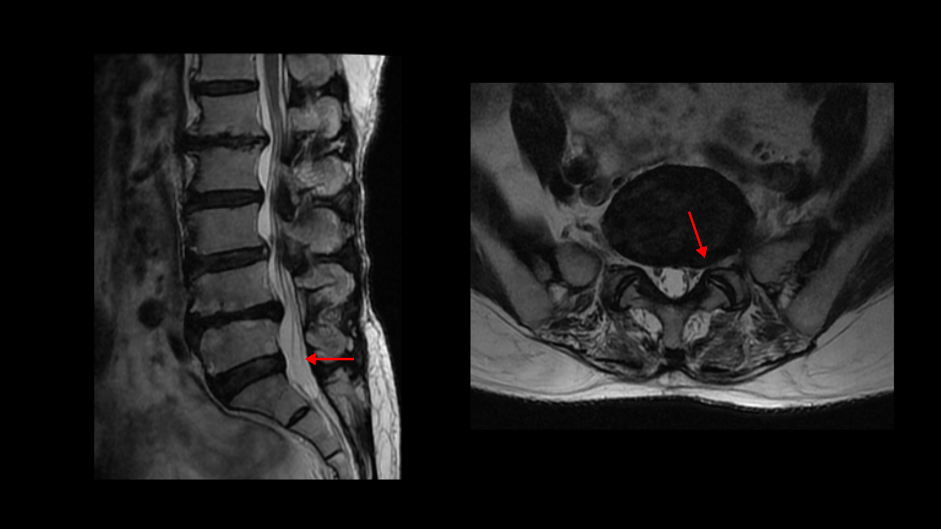 5-1번에는 왼쪽으로 디스크가 밀려 나와있고 전반적으로 왼쪽이 상태가 더 안 좋은데 이분의 증상도 왼쪽 엉덩이와 다리의 통증과 저림 및 마비감입니다.