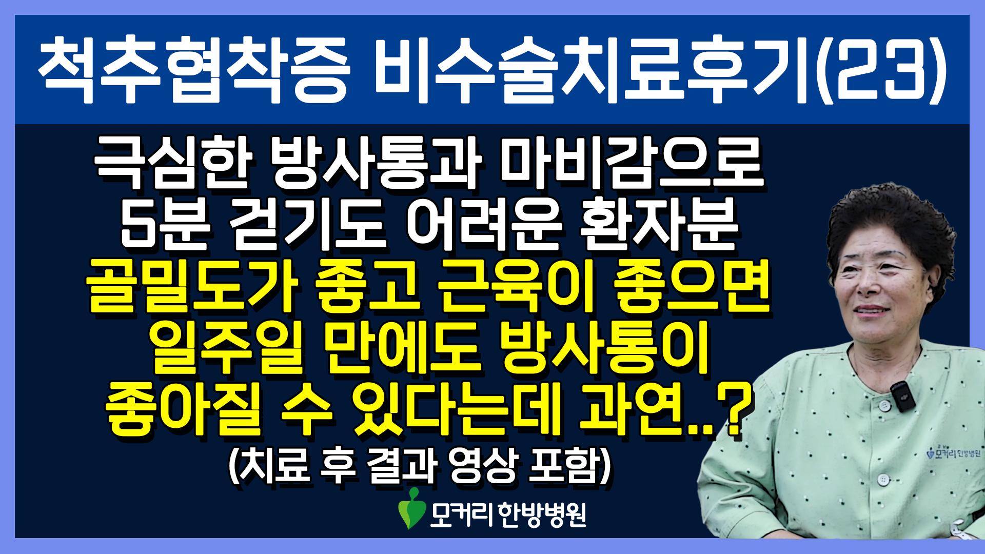 이렇게 허리 주변 근육들이 좋아지면 허리를 잘 버텨주니까 많은 환자분들이 신경이 눌려서 신경학적 증상이라고 여기는 다리저림, 방사통, 엉덩이 통증, 다리 힘빠짐, 증상들이 좋아지는 겁니다. 이것이 바로 협착증이 수술 없이 치료 가능한 이유입니다. 이분의 골밀도 수치가 매우 좋다고 말씀 드렸는데요. 골밀도와 함께 근육량이나 근력이 좋은 분들은 일반적으로 호전 반응도 빠르고 입원 기간도 짧습니다. 그래서 이분도 3주만 입원하셨는데요. 그럼 이 환자분은 3주간의 입원치료로 얼마나 어떻게 좋아지셨을까요? 다리가 저리고 아프고 마비감이 있어서 몇 분 걷기도 힘드셨는데 치료 후에 얼마나 잘 걷게 되셨을까요? 허리가 굽으셨는데 허리를 더 반듯이 펴고 잘 걸으실 수 있게 되셨을까요? 이분의 치료 후 결과가 궁금하시다면 아래 영상을 꼭 보시길 바랍니다.