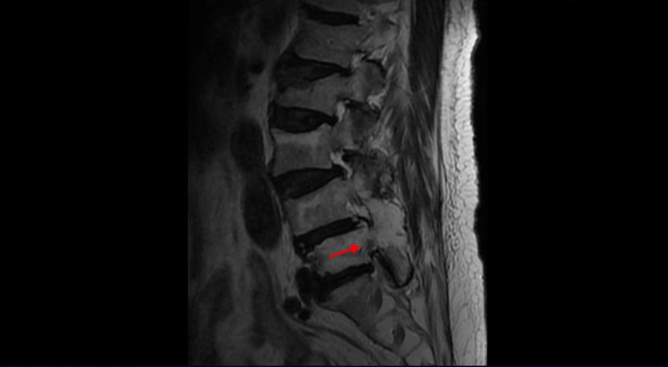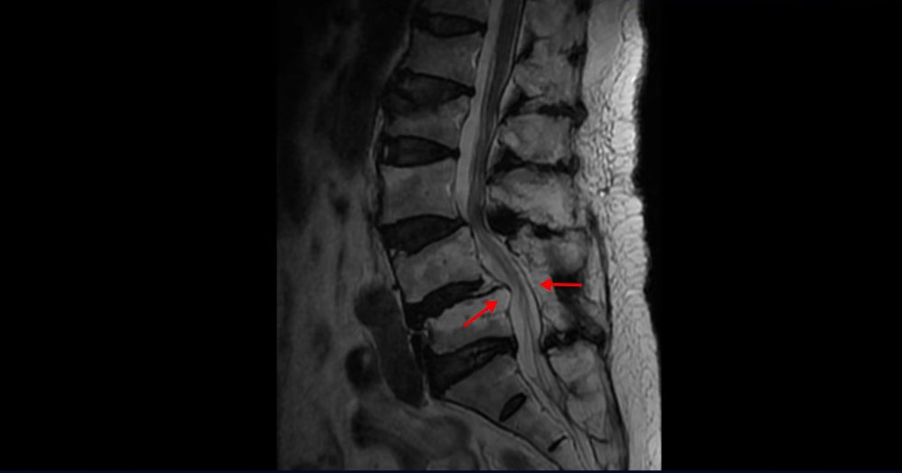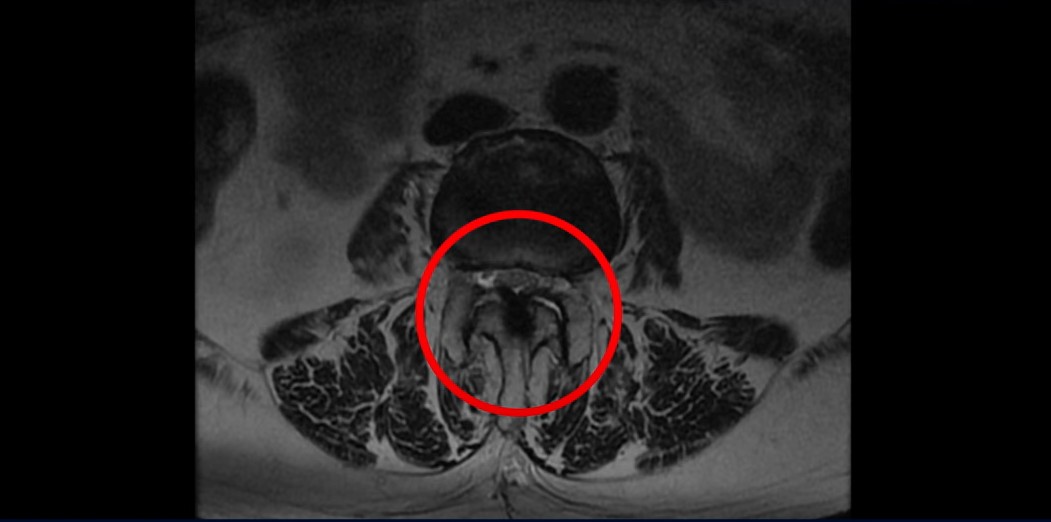 이 환자분은 협착증 수술 예약을 날짜까지 잡아놓고 넘어지면서 압박골절이 발생하고 협착증 증상 즉, 골반과 다리증상이 심하게 악화됩니다. 이분 MRI를 보시면 척추 2번 뼈에는 넘어지면서 생긴 척추압박골절이 보입니다.