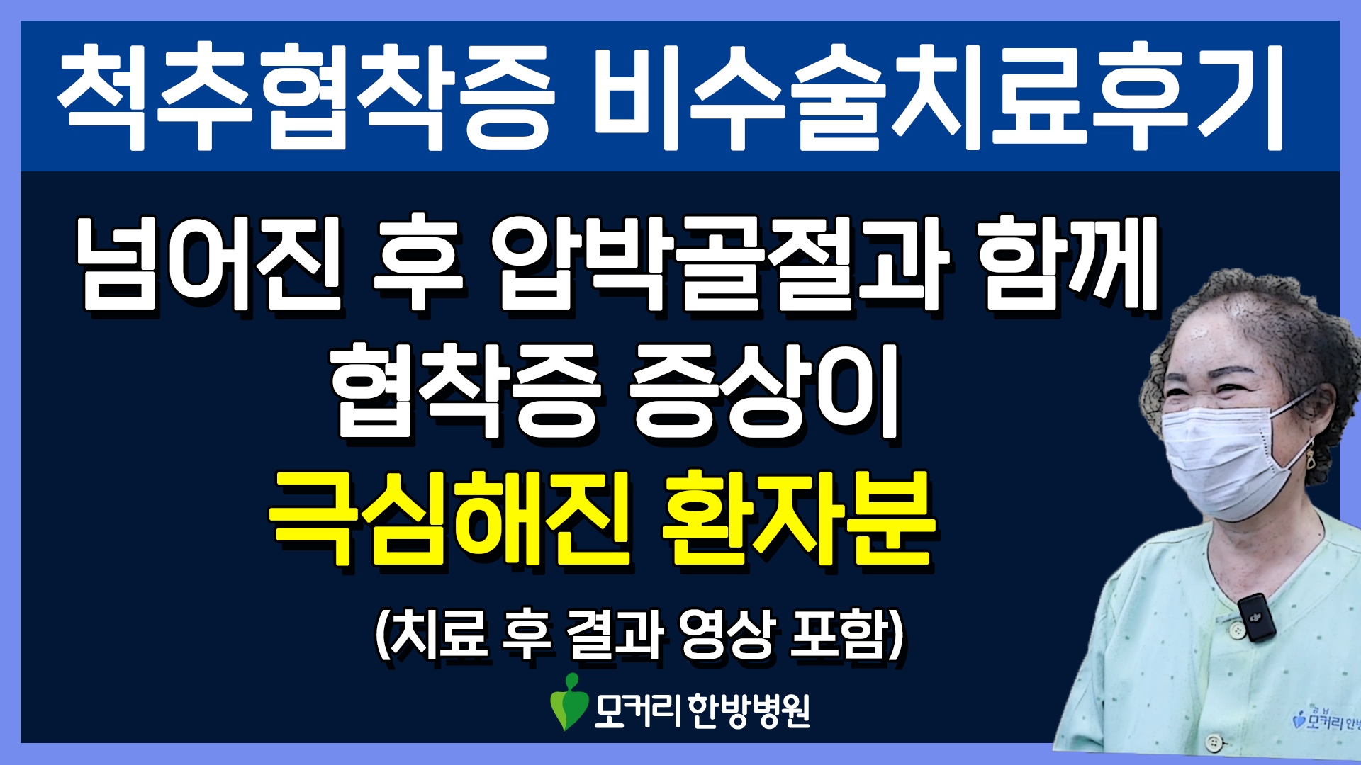 자 그럼 이 환자분은 입원치료로 얼마나 빨리 어떻게 좋아지셨을까요? 이렇게 아프다가 죽는구나라고 생각하셨다는데 단 몇 주의 치료로 수술 예약을 잡을 당시보다도 훨씬 더 악화된 협착증 증상이 과연 좋아질 수 있을까요? 넘어진 후에 갑자기 악화된 협착증 증상이 일반적으로 치료가 더 쉽고 빠르다고 말씀 드렸는데 그럼 1-2주 사이에 많이 좋아지셨을까요? 이분의 치료 후 결과가 궁금하시다면 아래 영상을 꼭 보시길 바랍니다.