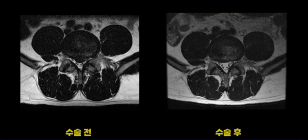 보시다시피 수술 전의 MRI와 비교해 보면 밀려 나온 디스크 수핵이 거의 대부분 깨끗이 제거되었습니다.