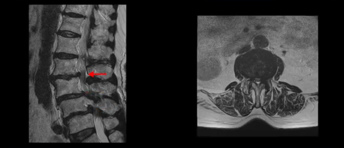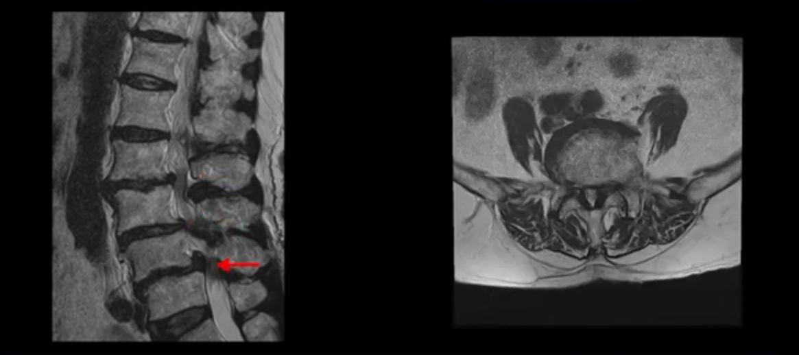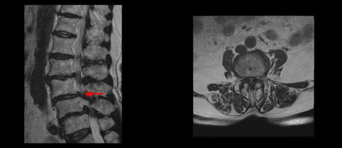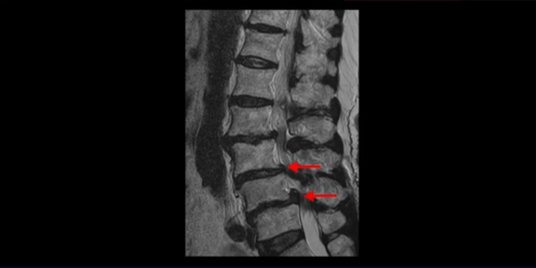 이 환자분 MRI를 보면서 더 자세히 설명 드리겠습니다. 이분은 허리의 다섯 마디가 다 안 좋은 환자분입니다. 84세 고령의 나이에 이렇게 여러 마디가 안 좋으면 대학병원에서도 수술이 어렵다는 얘기를 듣는 경우가 많습니다. 또 수술을 하더라도 결과가 안 좋을 수 있다는 얘기를 들을 가능성이 높습니다.