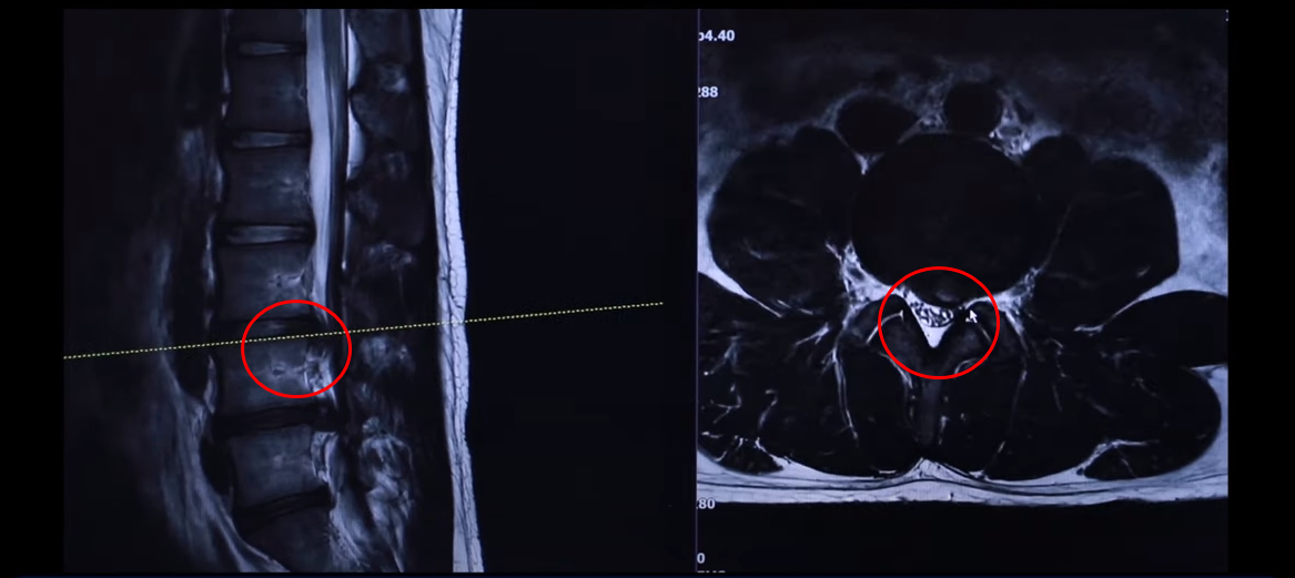 왼쪽 다리에 참을 수 없을 정도로 심한 방사통이 생긴 겁니다. 이분이 디스크가 왜 터졌냐? 24살이신데 어릴 때부터 허리가 아팠습니다. 고등학교 때부터 오랫동안 허리가 아팠기 때문에 나이에 맞지 않게 세 마디가 벌써 퇴행돼 있죠. 군대 때도 아팠고 최근에 중량 스쿼트, 웨이트 트레이닝 하다가 디스크가 터지게 됩니다. 웨이트 트레이닝 하다가 다리가 이상한 걸 느껴서 병원에 가서 MRI를 찍어 보니까 이렇게 심하게 터져 있습니다. 보통 이렇게 심하게 터져 있으면 어느 병원을 가든 정형외과나 신경외과에서 수술을 해야 된다 이런 얘기를 들을 가능성이 있습니다.