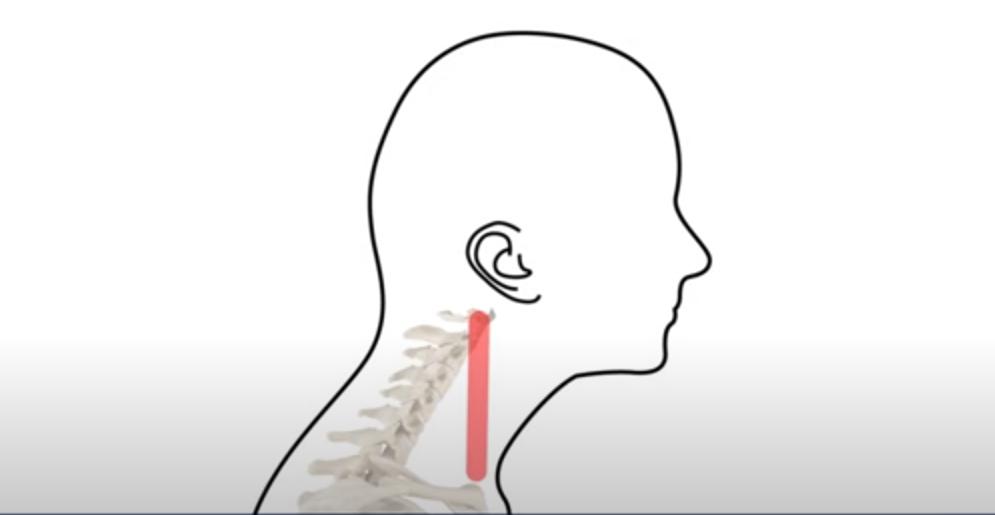 그리고 이게 일자면서도 앞으로 밀려나가 있습니다. 그래서 이걸 거북목이라고 합니다. 이런 형태의 목을 가지신 분들은 이 목 주변 근육이 정상일 수가 없습니다. 엄청나게 뭉쳐 있고 굳어 있고 특히 이 앞쪽 근육들은 머리가 앞으로 밀려나가다 보니까 짧아져 있습니다. 짧아져 있기 때문에 머리를 자꾸 앞으로 잡아당기는 겁니다. 그래서 거북목 환자들이 좋은 자세를 유지하고 싶어도 유지하기가 어려운 이유가 바로 이쪽 근육들이 심하게 단축돼 있고 뭉쳐 있기 때문입니다.