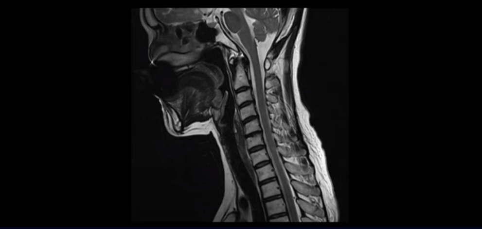 이분 MRI를 보실까요? 일자목에 머리가 앞으로 밀려 나간 거북목 체형입니다.