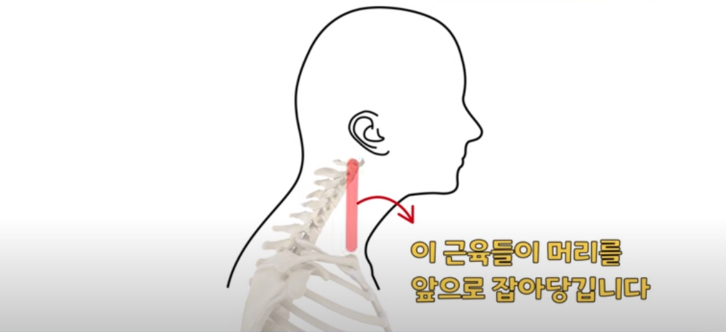 거북목 체형의 환자들은 목 앞쪽 근육, 가슴 근육 등이 매우 짧아지고 굳어 있는 상태입니다. 이 앞쪽 근육들이 짧아져 있으니까 아무리 등을 펴려고 해도 나도 모르게 머리가 앞으로 밀려 나가고 등이 구부러지는 겁니다.