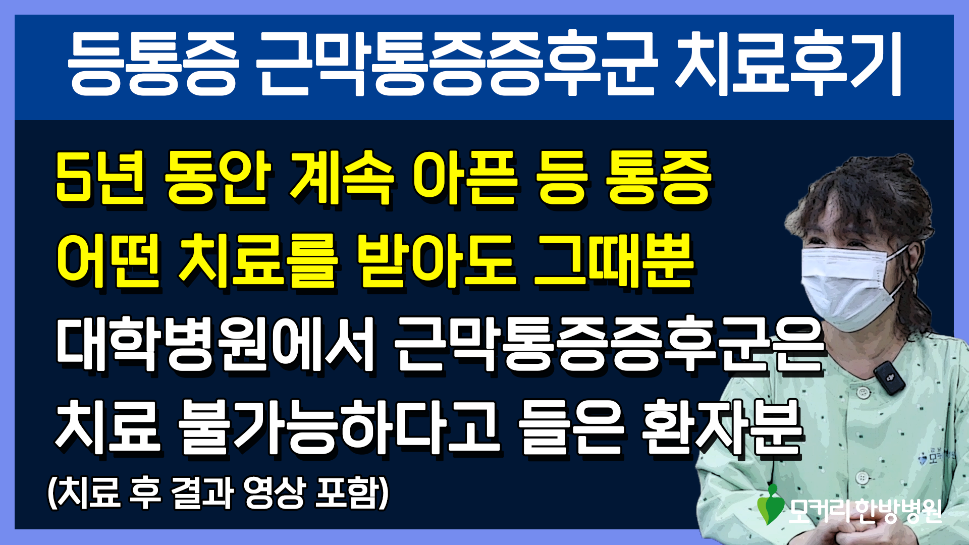 대학병원은 OO에 있는 거 거기 한 군데 가고 모커리 오기 전에 한 2주 전인가 대학병원에 갔어요. 이번에 마지막으로 대학병원 갔는데 MRI 찍은 걸 가지고 갔거든요. 교수님이 보고 제가 ‘여기가 아파요’ 그랬더니 여기 등을 눌러 보시더라고요. 그러더니 근막통증증후군이라고 그러면서 이거는 나을 수 없다고 거기서도 내내 고칠 수 없으니까 아프면 주사 맞는 방법밖에 없다 그래서 되게 절망스러웠거든요. 난 이렇게 살 수 없는데 너무 아픈데 대학병원에서 안 된다고 하길래 이렇게 아파 갖고는 도저히 살 수가 없는데 마음속으로는 죽고 싶은 생각이 들면서 한방으로 고칠 수 없나 하고 인터넷을 뒤져봤어요. 그랬더니 여기 모커리 병원이 나오면서 홈페이지에 아픈 사람한테 도움되는 말이 써있더라고요. 그래서 전화를 했어요. 그때 치료후기 동영상 2개를 보내주셨거든요. 치료할 수 있으니까 상담하고 찾아왔어요. 모커리 원장님도 근막통증증후군이라고 하시더라고요. 아픈 지가 너무 오래됐으니까 입원 치료를 하는 게 나을 것 같다고 하셔서 입원 치료를 했어요.