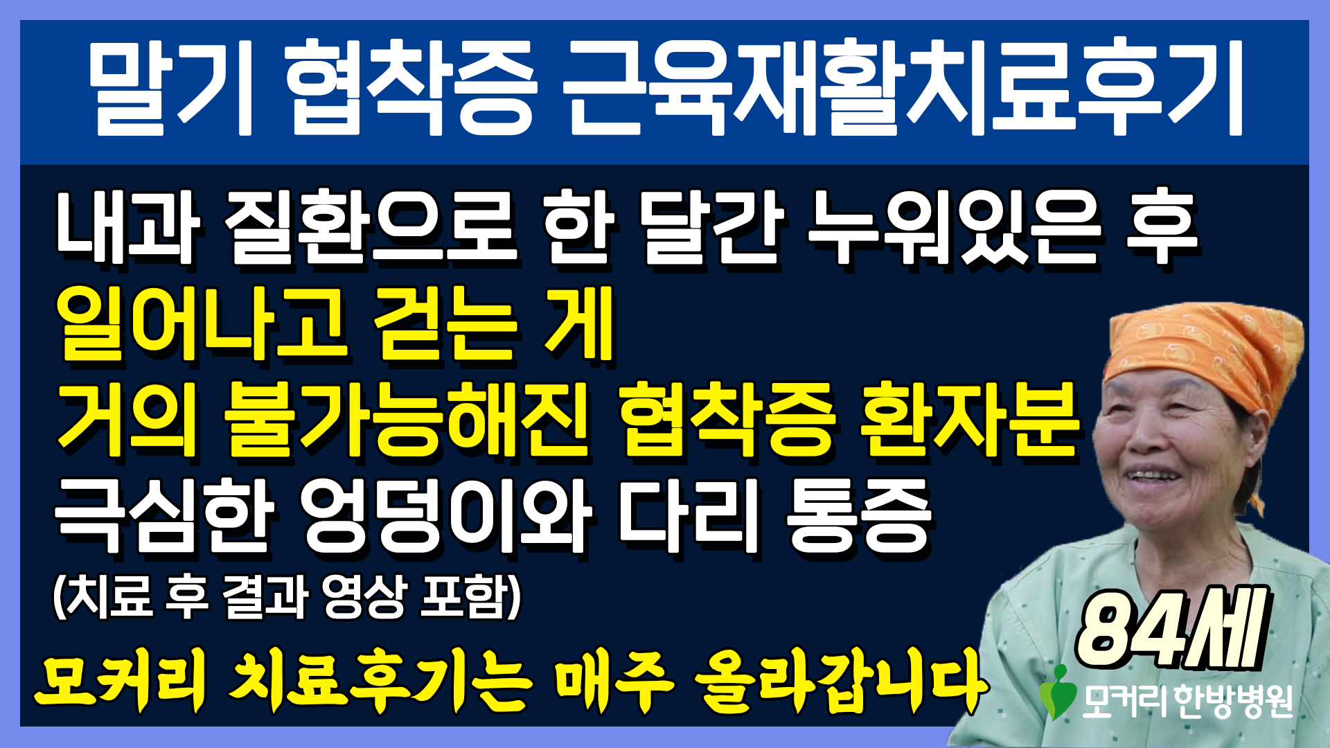 하지만 이런 고령 환자들의 취약한 근육은 하루 아침에도 심각한 문제가 생길 수 있습니다. 80대 중반 이후 근육이 극히 취약한 상태에서는 혹시라도 골절수술 등으로 한 달씩 누워 있어야 되는 일이 생기거나 또는 일살 생활 중 사소한 잘못된 움직임 하나만으로도 근육이 심하게 뭉치고 뒤틀리면서 극심한 허리, 엉덩이나 다리 통증이 발생할 수 있습니다. 그리고 저희 모커리한방병원에서 수없이 반복해서 설명하지만 근육이 문제가 생기면 신경도 더 눌립니다. 즉 협착증도 심해집니다.