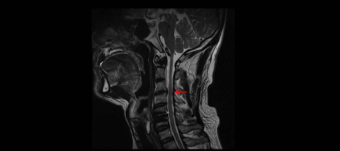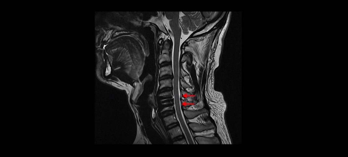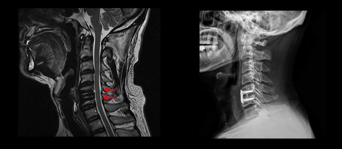 MRI를 보시면 목 5번 6번 마디에 나사가 박힌 유합술이 되어있습니다.