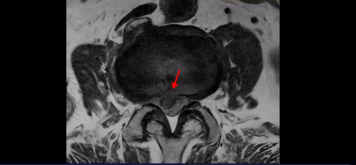 이 환자분은 협착증이 심하지 않았었는데 사무실 의자에서 두 번 넘어진 후에 왼쪽 다리는 마비 증상, 즉 힘빠짐 증상이 생기고 오른쪽 다리에는 심한 방사통이 생겨서 걸음을 거의 걷지 못하게 되어 휠체어까지 타게 된 환자분입니다.