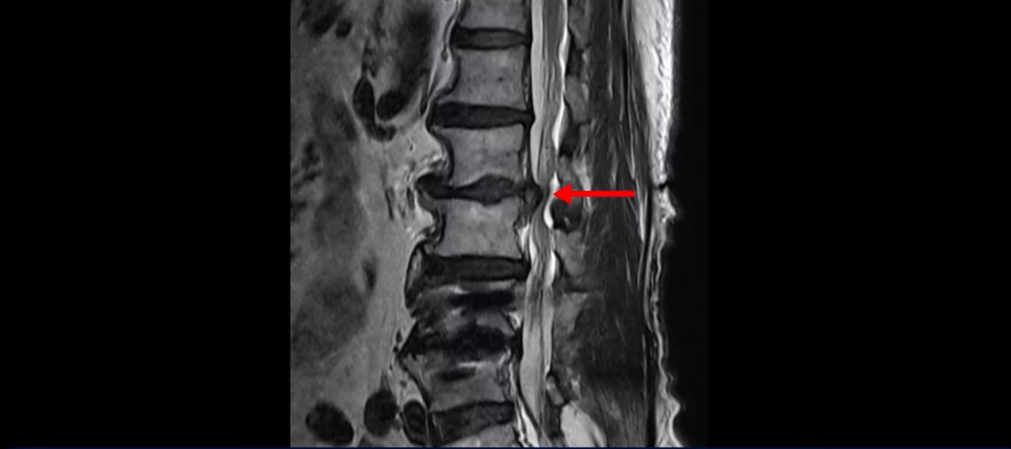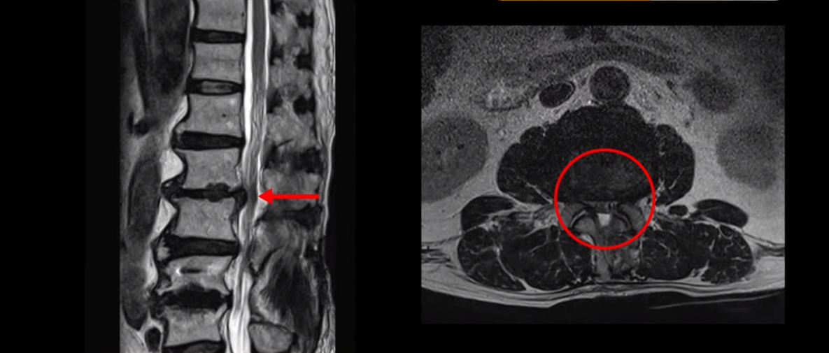 이분 허리 MRI를 보면서 간단히 설명드린 후 유합술 이후 인접마디에 문제가 생긴 환자분들이 왜 추가적인 수술을 서두르기보다는 허리기능을 살려주는 근육신경재활치료를 받는 게 좋은지, 또 치료는 어떻게 하는 게 좋은지 자세히 설명드리겠습니다. 이분 MRI를 보면 4번 5번에 나사가 박혀있습니다.