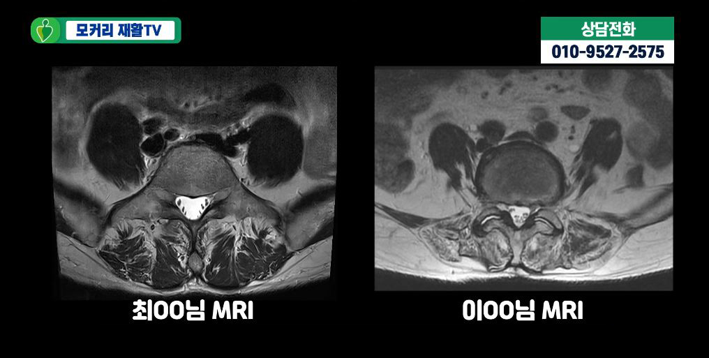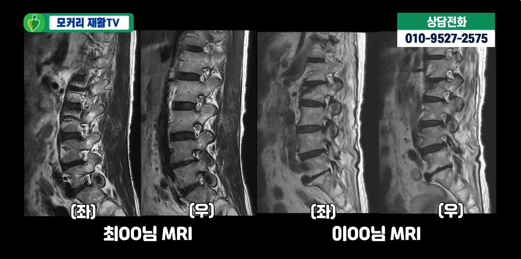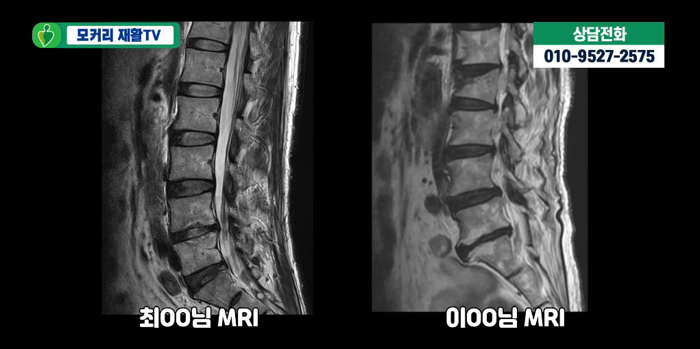 이 환자분들의 MRI를 보면 두분 다 60세 이상이시라 노화로 인해 MRI상으로 협착과 퇴행성디스크가 보입니다.