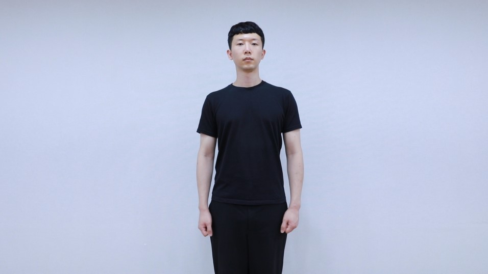 우선 허리에 부담 가지 않을 정도로 반듯하게 서서 고개를 들고 정면을 바라봅니다.