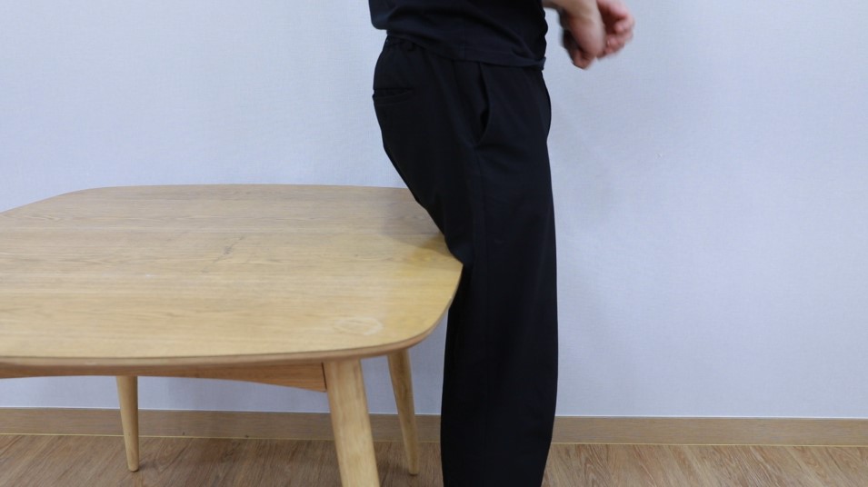 이때 골반이 비틀어지는 것을 막기 위해 엉덩이를 책상이나 테이블에 대주고 서면 좋습니다.