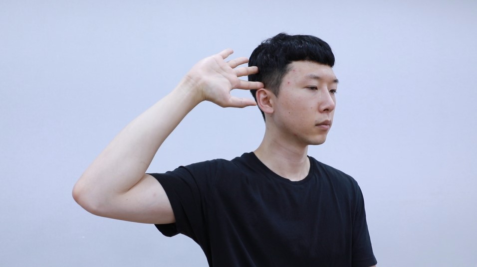 그 상태로 오른쪽 팔을 들고, 구부려 손바닥은 펴서 정면을 향하고, 검지 손가락 끝이 오른쪽 귀의 맨 윗부분과 만나도록 합니다.
