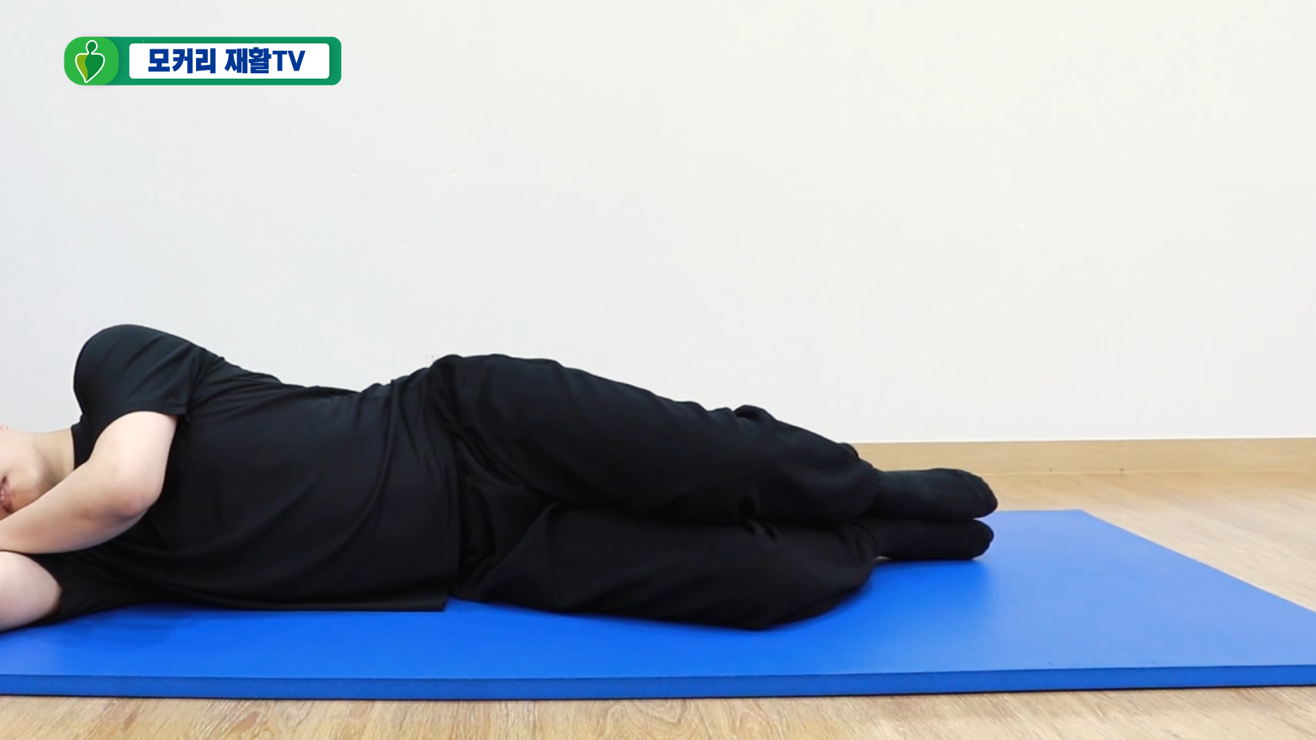 통증이 있는 아픈 쪽의 다리가 위를 향하도록 옆으로 눕습니다. 이때 베개를 베거나, 만약 베개가 없으면 팔베개를 하고 다른 쪽 팔은 바닥을 짚어 상체를 고정합니다.