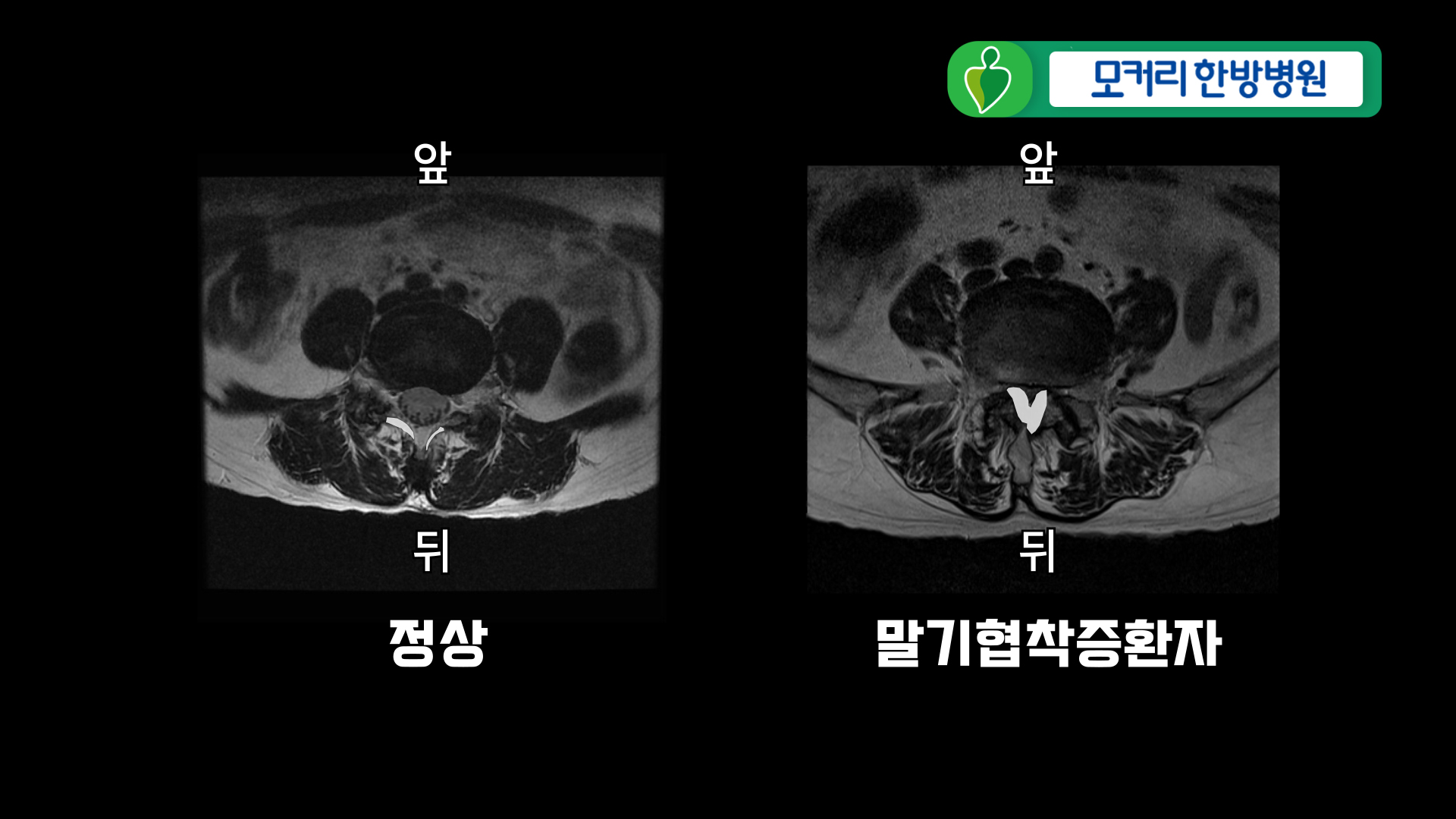 척추를 옆에서 바라본 MRI 사진입니다. 왼쪽은 정상 척추, 오른쪽은 협착증 환자의 척추 MRI 사진입니다. 협착증 환자는 허리 전체 마디가 퇴행되어 있습니다.