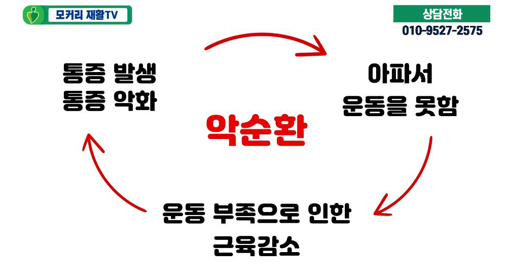 아프니까 운동을 잘 못하게 되고, 특히 걸으면 아프니까 못 걷게 되고, 또 운동을 안 하게 되니까 근육이 더 빨리 줄어들고, 근육이 더 줄어드니까 협착증 증상이 점점 더 악화될 수밖에 없습니다.