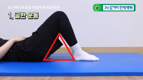 자연스럽게 누운 상태에서 다리를 살짝 벌린 다음, 발목을 움직여서 발끝이 내 몸 쪽을 향하도록 살짝 당겨줍니다.